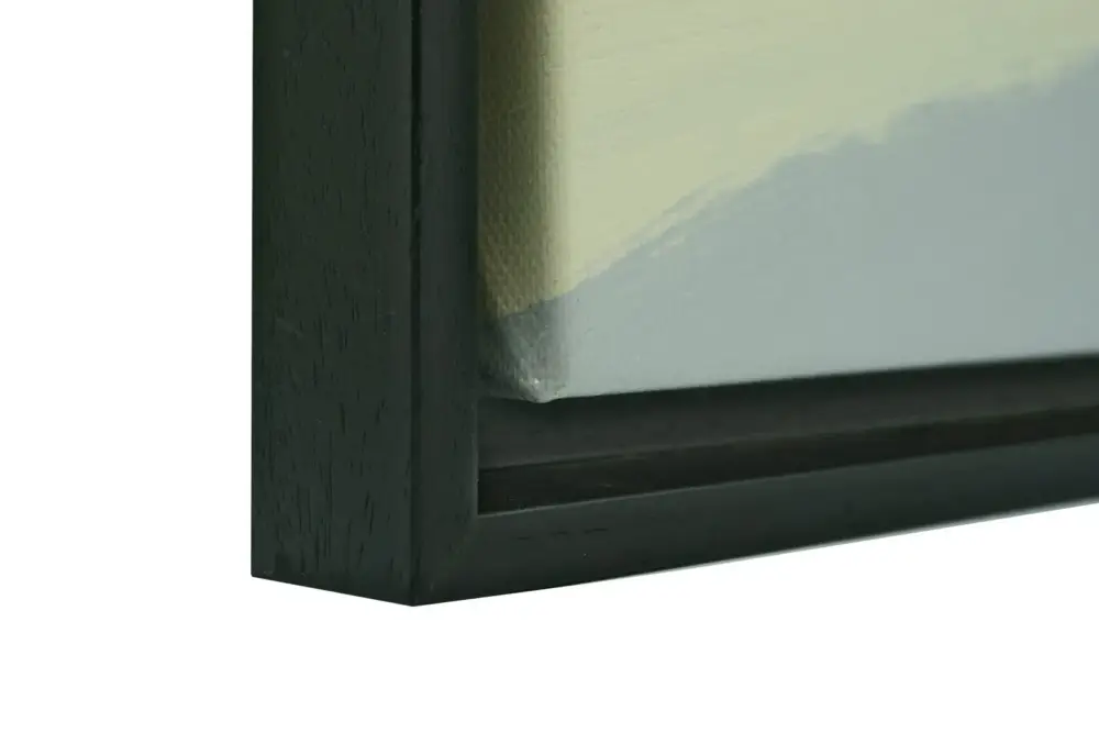 Deze baklijst is geschikt voor een frame/spieraam van 1,5-2,5 cm dik en past hiermee op vrijwel elk schilderij uit de collectie van Betaalbarekunst. De lijst is zwart gespoten en heeft een natuurlijke, zichtbare houtnerf. De ruimte (marge) tussen het schilderij en de lijst (zie tekening) geeft een mooi diepte-effect en is standaard 1 cm. De gehele lijst en de marge kunnen we in onze werkplaats naar wens aanpassen (zie tab maatwerk).