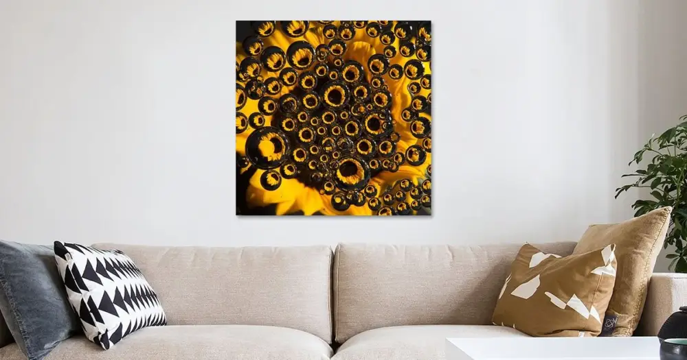 Zomers gevoel: Gele zonnebloem door druppels heen (vierkant) van Marjolijn van den Berg – NL429482M13S60x60 Commander Maintenant